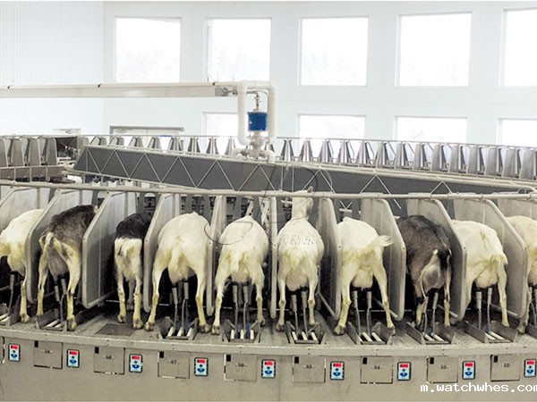 阿菲金转盘式奶山羊挤奶机是利用可转动的环形挤奶台进行挤奶流水作业,其特点是奶山羊鱼贯进入挤奶厅,挤奶员在入口处冲洗乳房,套奶杯,不必来回走动,操作方便,每转一圈7~10分钟,转到出口处已挤完奶,劳动效率高,适用于较大规模奶羊场。